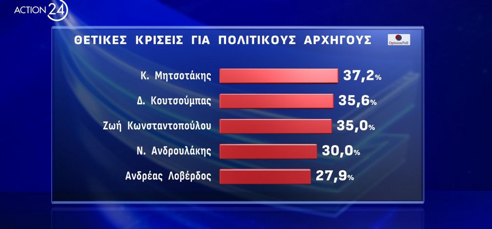 Δημοφιλέστερος πολιτικός αρχηγός παραμένει ο Κυριάκος Μητσοτάκης με θετικές γνώμες 37,2%, και ακολουθούν: Δ. Κουτσούμπας, Ζ. Κωνσταντοπούλου, Ν. Ανδρουλάκης, Α. Λοβέρδος, Κ. Βελόπουλος. Ο Στ. Κασσελάκης είναι έβδομος.