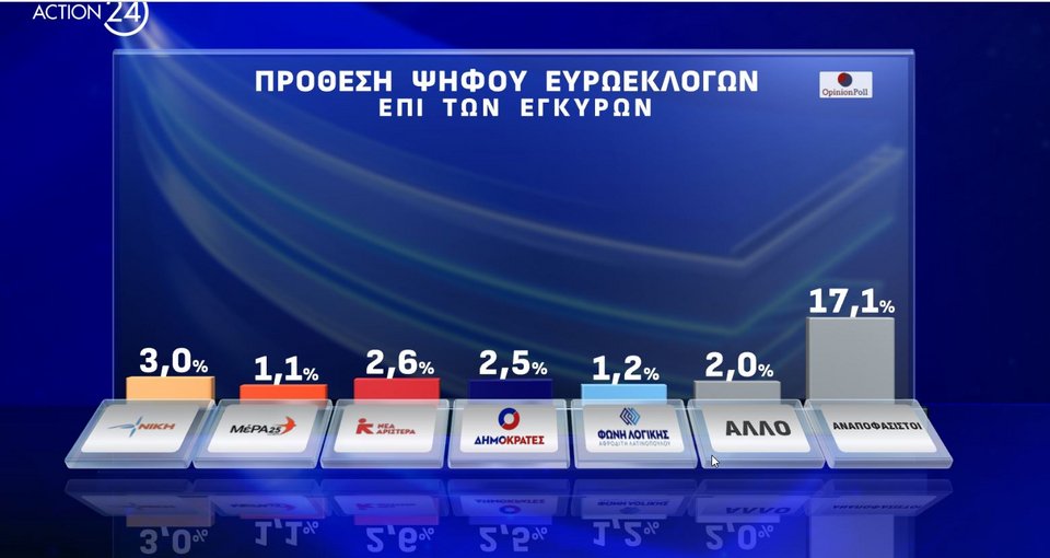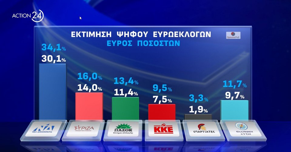 Σταθερό προβάδισμα 17,1 ποσοστιαίων μονάδων και κατώφλι στο 30,1% που μπορεί να φτάσει και 34,1% για τη ΝΔ αποτυπώνει δημοσκόπηση της Οpinion Poll για το Action24.