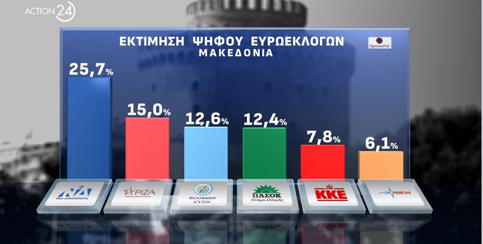 Στη μέτρηση εκτίμησης ψήφου για την περιοχή της Μακεδονίας, η ΝΔ συγκεντρώνει 25,7%, ο ΣΥΡΙΖΑ 15%, ενώ η Ελληνική Λύση είναι τρίτη με 12,6%. Το ΠΑΣΟΚ ακολουθεί με 12,4% και έπονται ΚΚΕ με 7,8%, Νίκη με 6,1%.
