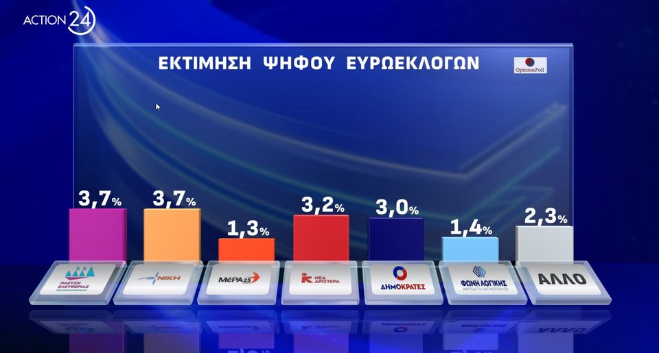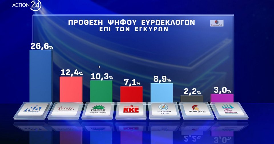 Στη δημοσκόπηση, που παρουσιάστηκε στο κεντρικό δελτίο ειδήσεων του Action24 με τον Βασίλη Τσεκούρα, η ΝΔ έχει «αέρα» κυριαρχίας και μάλιστα μπορεί να υπερβεί και το ποσοστό των προηγούμενων ευρωεκλογών, όπου είχε λάβει 33,1%. Στη δεύτερη θέση παγιώνεται και σε αυτή τη δημοσκόπηση ο ΣΥΡΙΖΑ, πολύ χαμηλότερα ωστόσο, ενώ το ΠΑΣΟΚ ακόμη και στο ταβάνι του είναι πίσω από το κόμμα Κασσελάκη.