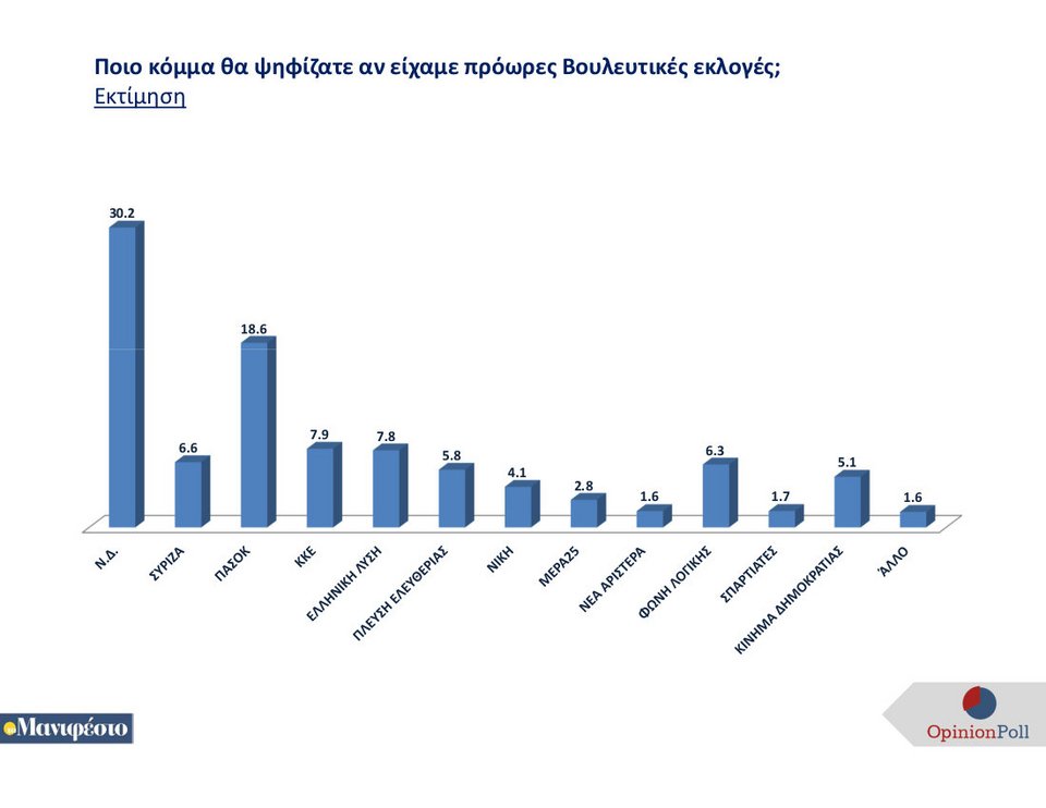 Στην εκτίμηση ψήφου η ΝΔ είναι πρώτη με 30,2%, στη δεύτερη θέση βρίσκεται το ΠΑΣΟΚ με 18,6%, ενώ ο ΣΥΡΙΖΑ βρίσκεται 5ος με 6,6%, πίσω από ΚΚΕ και Ελληνική Λύση, με τη Φωνή Λογικής να βρίσκεται στο 6,3%.