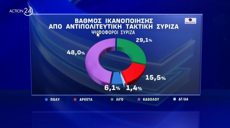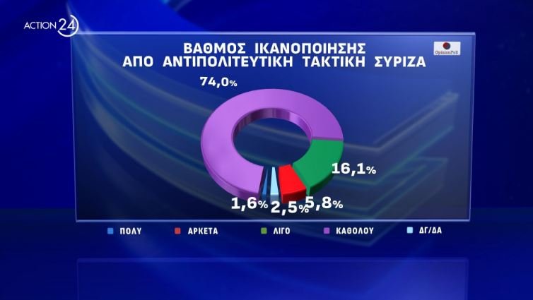Πάνω από 7 στους 10 (ποσοστό 74%) δηλώνει ότι δεν είναι καθόλου ικανοποιημένο από την αντιπολιτευτική τακτική του ΣΥΡΙΖΑ, έναντι μόλις 16,1% που δηλώνει «λίγο»