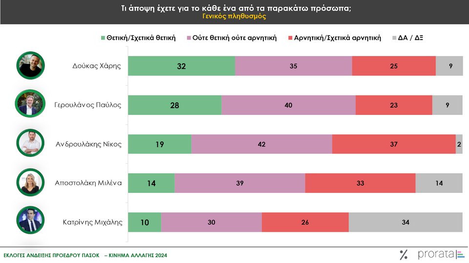 Πιο συγκεκριμένα, το 32% διατηρεί θετική άποψη για τον δήμαρχο Αθηναίων, το 28%, αντίστοιχα, για τον Παύλο Γερουλάνο, ενώ ακολουθεί με 19% ο πρόεδρος του ΠΑΣΟΚ, Νίκος Ανδρουλάκης, με 14% η Μιλένα Αποστολάκη και με 10% ο Μιχάλης Κατρίνης.
