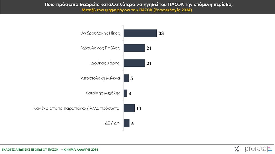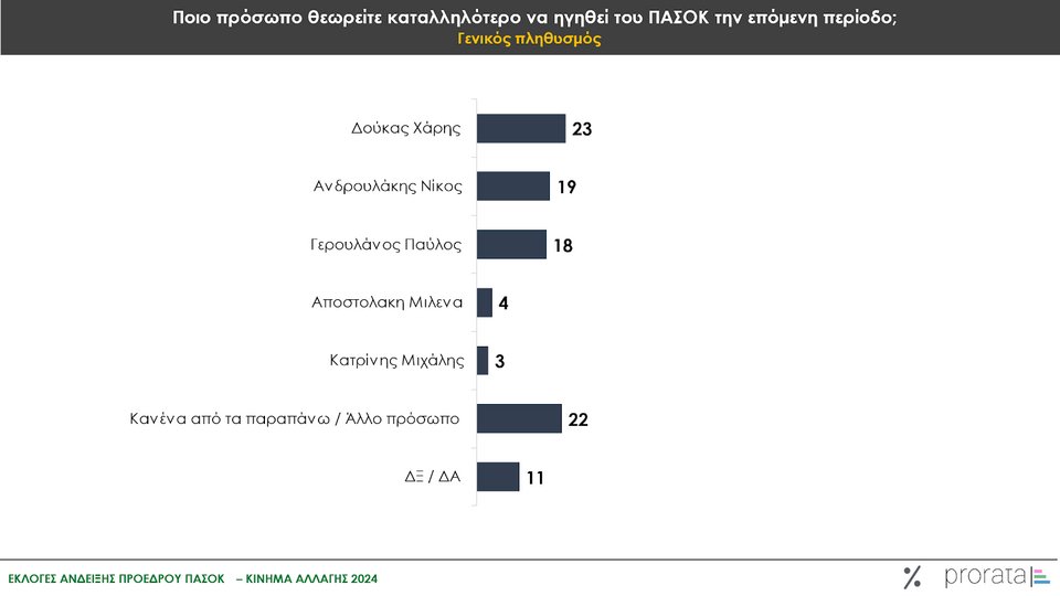 Ως προς την καταλληλότητα του εκάστοτε προσώπου για την ανάληψη της ηγεσίας του ΠΑΣΟΚ-Κινήματος Αλλαγής, ο Χάρης Δούκας (23%) προηγείται των υπολοίπων υποψηφίων στη μεγάλη δεξαμενή του γενικού πληθυσμού, ακολουθούμενος από τον Νίκο Ανδρουλάκη (19%) και τον Παύλο Γερουλάνο (18%).