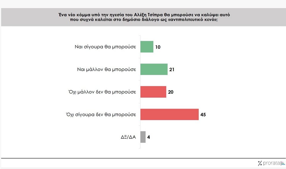 Πάνω από 6 στους 10 (ποσοστό 65%) θεωρούν ότι ένα κόμμα Τσίπρα σίγουρα και μάλλον δεν μπορεί να καλύψει το αντιπολιτευτικό κενό, έναντι 31% που απαντά σίγουρα και μάλλον.