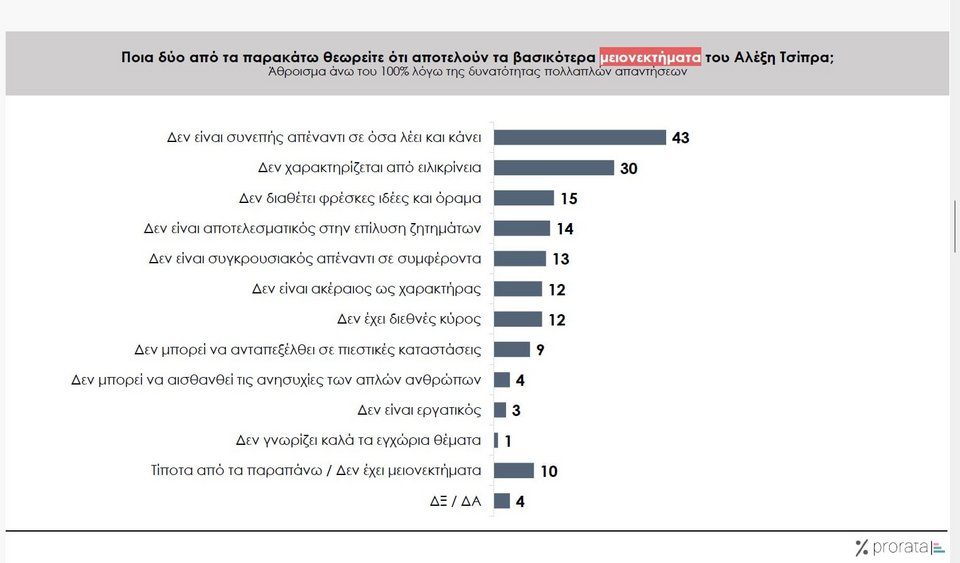 Η ασυνέπεια αποτελεί το βασικό του μειονέκτημα, σύμφωνα με το 43%, «η ανειλικρίνεια» απαντά το 30%, «η έλλειψη φρέσκων ιδεών» θεωρεί το 15%, «η αναποτελεσματικότητα» λέει το 14%.