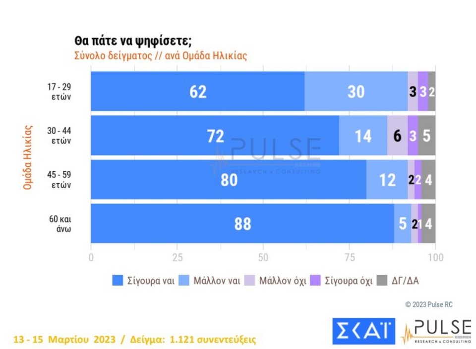 Ειδικότερα, οι νέοι 17-29 ετών λένε πως θα πάνε στη κάλπη σε ποσοστό 92%, ενώ στο 93% είναι οι 60 ετών και άνω.