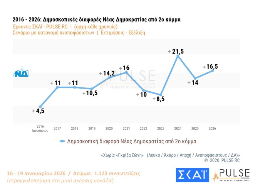 Από τα στοιχεία προκύπτει ότι το σημερινό προβάδισμα των 16,5 μονάδων στην εκτίμηση ψήφου είναι το δεύτερο μεγαλύτερο από το 2016, όταν ο Κυριάκος Μητσοτάκης εξελέγη πρόεδρος της ΝΔ. Η μεγαλύτερη διαφορά είχε καταγραφεί το 2024.