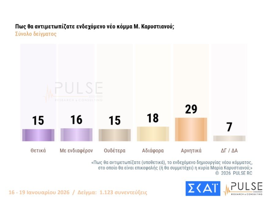 Συνολικά, το 31% των ερωτηθέντων δηλώνει ότι βλέπει θετικά ή με ενδιαφέρον το ενδεχόμενο ίδρυσης κόμματος από τη Μαρία Καρυστιανού - μέτρηση που δημοσιεύεται για πρώτη φορά από την Pulse.