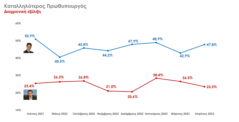 Στη διαχρονική εξέλιξη του σχετικού ερωτήματος αποτυπώνεται ότι ο Κυριάκος Μητσοτάκης επιστρέφει δυναμικά στα υψηλά του Ιουνίου 2021 (τότε είχε 50,9%). Δείχνει δε να έχει αφήσει πίσω του μακράν την κάμψη που είχε υποστεί τον Μάρτιο, μετά την τραγωδία των Τεμπών. Στον αντίποδα, ο πρόεδρος του ΣΥΡΙΖΑ στο σχετικό ερώτημα ακολουθεί καθοδική πορεία με 23,5%, όταν τον Ιούνιο του 2021 ήταν στο 25,4%.