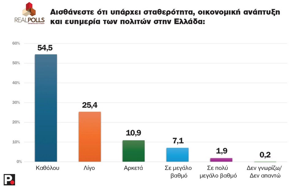 Χαρακτηριστικό είναι ότι στο ερώτημα: «Αισθάνεστε ότι υπάρχει σταθερότητα, οικονομική ανάπτυξη και ευημερία των πολιτών στην Ελλάδα;», που αποτελεί και το κυρίαρχο αφήγημα της κυβέρνησης, γύρω στο 80% των πολιτών απαντούν «Καθόλου» και «Λίγο».