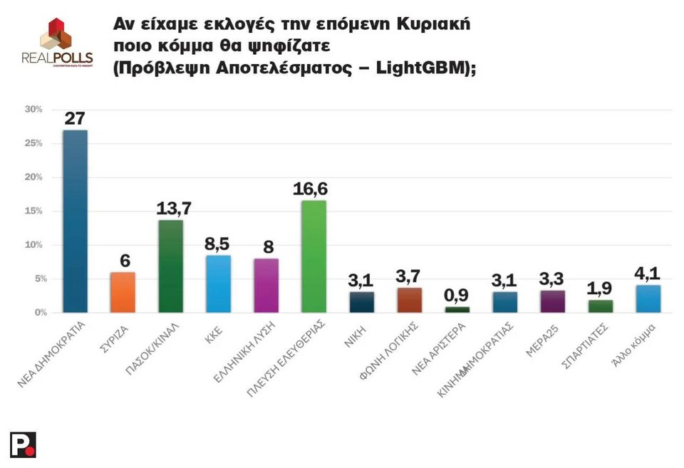 Στην πρόβλεψη αποτελέσματος, η Νέα Δημοκρατία μετρήθηκε στο 27%, πλησιάζοντας την εκλογική επίδοση του περασμένου Ιουνίου, ενώ η Πλεύση Ελευθερίας εκτιμήθηκε στο 16,6% - ένα εντυπωσιακό ποσοστό, ακόμα και αν πρόκειται γι' αυτό που συνηθίζουμε να λέμε «φωτογραφία της στιγμής».