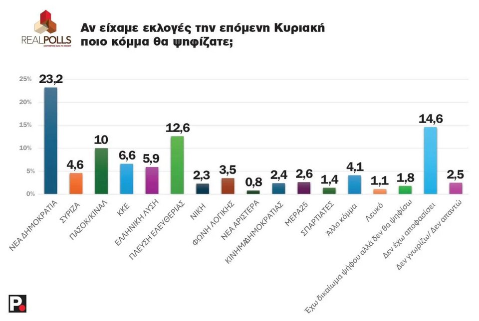 Στο ερώτημα αν είχαμε εκλογές την προσεχή Κυριακή ποιο κόμμα θα ψηφίζατε, η ΝΔ παραμένει πρώτη με 23,2%, έχοντας μάλιστα αυξήσει τα ποσοστά της από την προηγούμενη μέτρηση (21,2%). Η Πλεύση Ελευθερίας εμφανίζεται δεύτερη με 12,6%, αφήνοντας πίσω το ΠΑΣΟΚ-ΚΙΝΑΛ, που, με 10%, έχει χάσει 1,2%.
