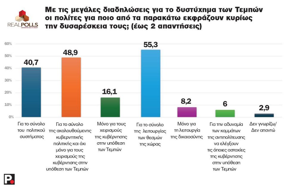 Χαρακτηριστικό είναι ότι το 55,3% θεωρεί ότι οι διαδηλώσεις αυτές εκφράζουν δυσαρέσκεια για τη λειτουργία των θεσμών, το 48,9% για το σύνολο της ακολουθούμενης κυβερνητικής πολιτικής και το 40,7% για το σύνολο του πολιτικού συστήματος.