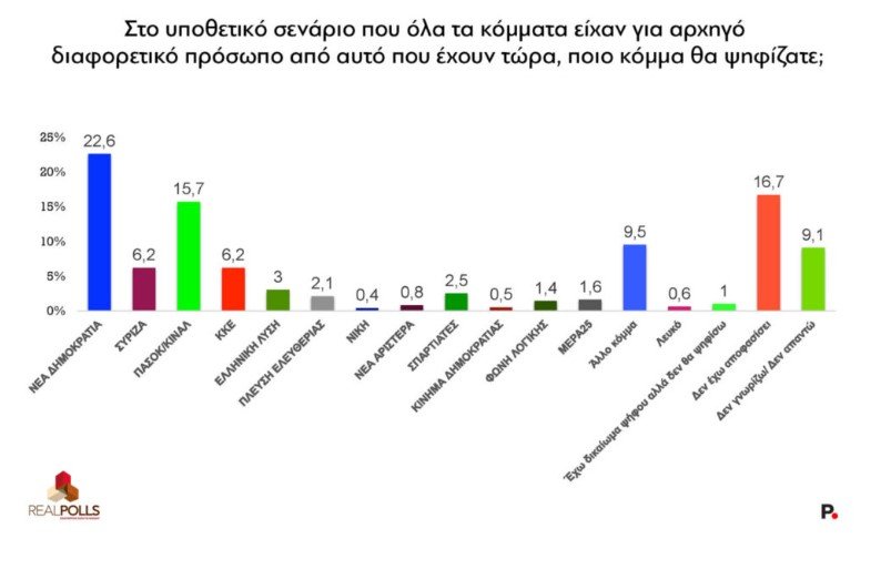 Η έρευνα της Real Polls καταγράφει επίσης την πρόθεση ψήφου σε υποθετικό σενάριο αλλαγής αρχηγών. Η ΝΔ χωρίς τον Κυριάκο Μητσοτάκη υποχωρεί στο 22,6%, ενώ το ΠΑΣΟΚ-ΚΙΝΑΛ χωρίς τον Νίκο Ανδρουλάκη εκτοξεύεται από 7,8% στο 15,7%. Κόμματα όπως η Πλεύση Ελευθερίας και η Ελληνική Λύση βλέπουν τα ποσοστά τους να μειώνονται σημαντικά.