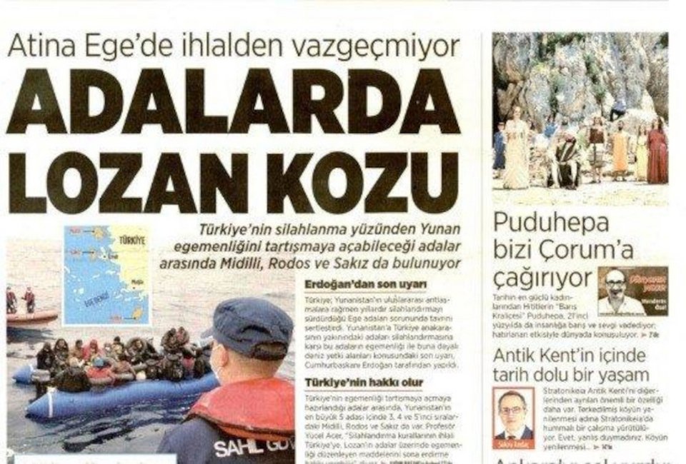 Από την πλευρά της, η Yeni Safak αναφέρει ότι 22 από τα 23 νησιά είναι στρατιωτικοποιημένα και καθιστούν «απειλή για την Τουρκία», ενώ μονάχα η Χάλκη είναι αποστρατιωτικοποιημένη.