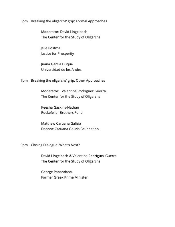 Το συνέδριο, όπως αναγράφεται σε σχετική πρόσκληση, έχει τίτλο «Breaking the Oligarchs’ Grip: The Athens Dialogues» και θέμα «τα αίτια, τους μηχανισμούς και τις επιπτώσεις της επικράτησης της ολιγαρχίας σε παγκόσμιο επίπεδο, καθώς και τη στρατηγική για τον περιορισμό της».