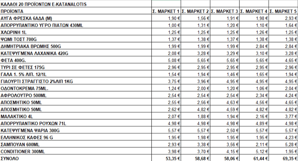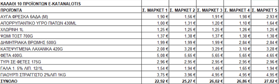 Στον πίνακα 1 της αναβαθμισμένης πλατφόρμας e-katanalotis παρακολουθούμε τη σύγκριση τιμών μεταξύ 5 διαφορετικών αλυσίδων σούπερ μάρκετ ενός καλαθιού που περιλαμβάνει τα ίδια ακριβώς 10 προϊόντα.