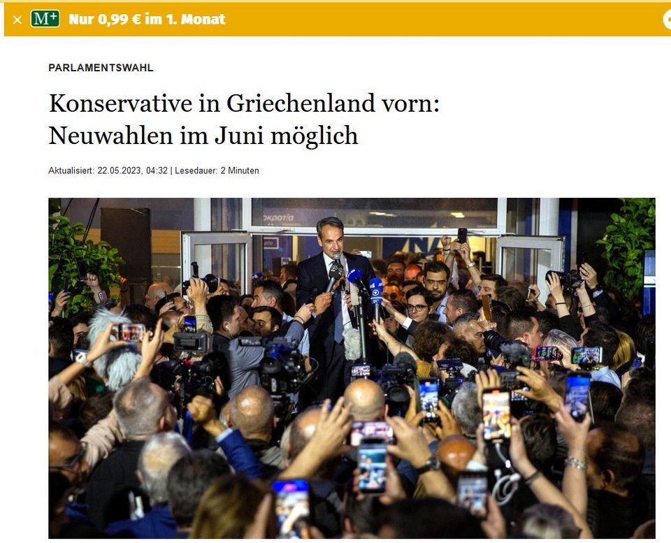 «Εκλογές στην Ελλάδα: Ο Τσίπρας τιμωρήθηκε άσχημα, ο Μητσοτάκης πανηγυρίζει ‘σεισμό’ και πηγαίνει σε νέες εκλογές», γράφει η Münchner Merkur σχολιάζοντας ότι «δεν υπάρχει καμία αμφιβολία για την εκλογική νίκη των συντηρητικών».