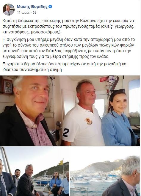 Ο Μάκης Βορίδης περιέγραψε την εμπειρία με ανάρτηση στα social media στην οποία αναφέρει: «Κατά τη διάρκεια της επίσκεψής μου στην Κάλυμνο είχα την ευκαιρία να συζητήσω με εκπροσώπους του πρωτογενούς τομέα (αλιείς, γεωργούς, κτηνοτρόφους, μελισσοκόμους). Η συγκίνησή μου υπήρξε μεγάλη όταν κατά την αποχώρησή μου από το νησί, το σύνολο του αλιευτικού στόλου των μεγάλων πελαγικών ψαριών με συνόδευσε κατά τον διάπλου, εκφράζοντας με αυτόν τον τρόπο την ευγνωμοσύνη τους για τα μέτρα στήριξης προς τον κλάδο. Ευχαριστώ θερμά όλους όσοι συμμετείχαν σε αυτή την μοναδική και ιδιαίτερα συναισθηματική στιγμή».