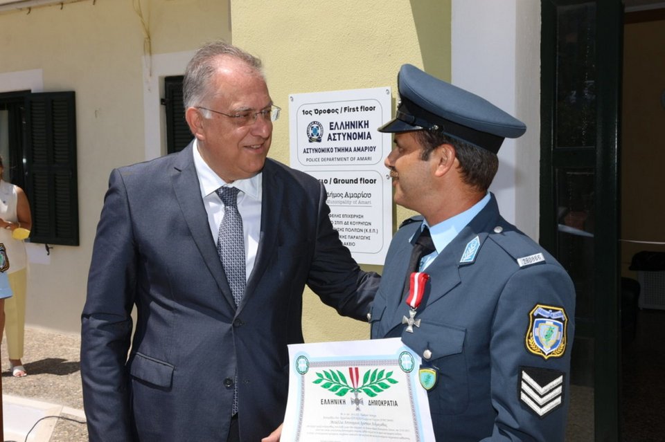 Ο υπουργός, στο πλαίσιο των εγκαινίων, βράβευσε τον αστυνομικό, αρχιφύλακα Γεώργιο Κυριακάκη, απονέμοντάς του το Μετάλλιο Αστυνομικού Αριστείου Ανδραγαθίας για έξοχη πράξη ανδραγαθίας που έλαβε χώρα στην επαρχιακό οδό Βρυσών - Βάμου Χανίων, όταν υπηρετούσε στο τότε Τμήμα Αστυνομικών Επιχειρήσεων Αποκορώνου.