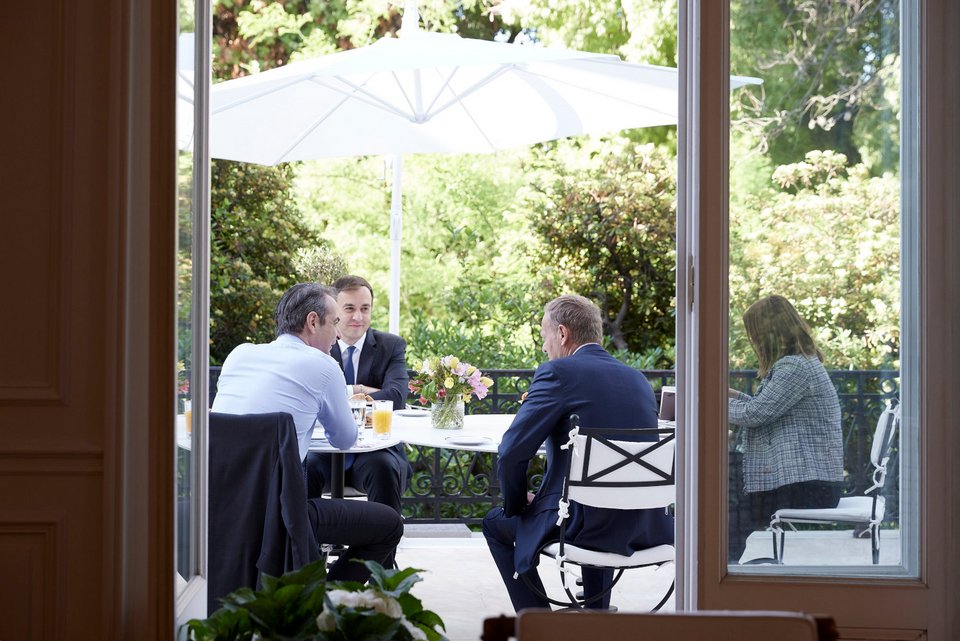 Πρόγευμα εργασίας στο Μέγαρο Μαξίμου με τον πρόεδρο του Ευρωπαϊκού Λαϊκού Κόμματος (ΕΛΚ) Ντόναλντ Τουσκ είχε σήμερα το πρωί ο πρωθυπουργός Κυριάκος Μητσοτάκης.