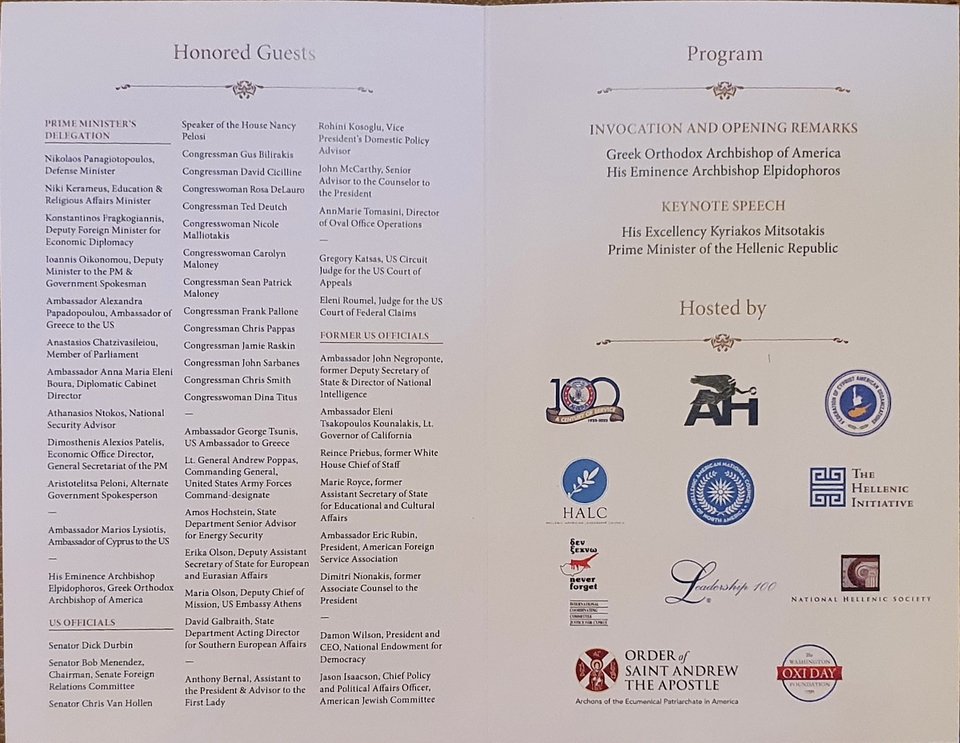 Ο Ελληνας πρωθυπουργός απηύθυνε χαιρετισμό στην ελληνοαμερικανική Κοινότητα, παρουσία του αρχιεπισκόπου Αμερικής Ελπιδοφόρου, της πρόεδρου της Βουλής των Αντιπροσώπων, Νάνσι Πελόζι και του προέδρου της Επιτροπής Εξωτερικών Σχέσεων της Γερουσίας, Μπομπ Μενέντεζ.