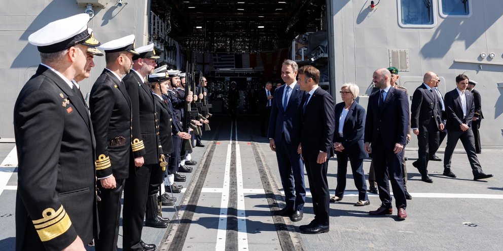 Παραγόμενη στο Λοριάν, αυτή η φρεγάτα άμυνας και επέμβασης που απέκτησε η Ελλάδα δείχνει τη δύναμη της στρατηγικής εταιρικής σχέσης που ενώνει τις δύο χώρες μας και την οποία ανανεώνουμε σήμερα.