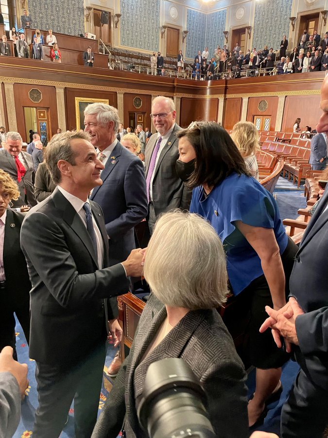 «Ως πρόεδρος της Βουλής, ήταν προνόμιό μου να υποδεχθώ τον Εξοχότατο Κυριάκο Μητσοτάκη, Πρωθυπουργό της Ελληνικής Δημοκρατίας, στο Καπιτώλιο των Ηνωμένων Πολιτειών σήμερα το πρωί, πριν από μια διμερή συνάντηση και την ομιλία του στην κοινή συνεδρίαση του Κογκρέσου». Νάνσι Πελόζι.
