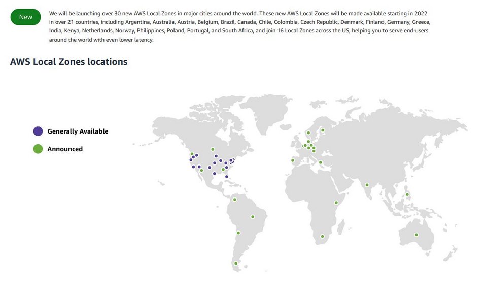 «Θα εγκαινιάσουμε περισσότερες από 30 νέες "τοπικές ζώνες" AWS σε μεγάλες πόλεις σε όλο τον κόσμο. Αυτές οι νέες Τοπικές ζώνες AWS θα είναι διαθέσιμες από το 2022 σε περισσότερες από 21 χώρες, όπως η Αργεντινή, η Αυστραλία, η Αυστρία, το Βέλγιο, η Βραζιλία, ο Καναδάς, η Χιλή, η Κολομβία, η Τσεχία, η Δανία, η Φινλανδία, η Γερμανία, η Ελλάδα, η Ινδία, η Κένυα, η Ολλανδία, η Νορβηγία, οι Φιλιππίνες, η Πολωνία, η Πορτογαλία και η Νότια Αφρική, και θα συνδεθούν με 16 Τοπικές Ζώνες σε όλες τις ΗΠΑ, βοηθώντας σας να εξυπηρετείτε τους τελικούς χρήστες σε όλο τον κόσμο με ακόμη μικρότερη χρονική καθυστέρηση», έκανε γνωστό η εταιρεία.