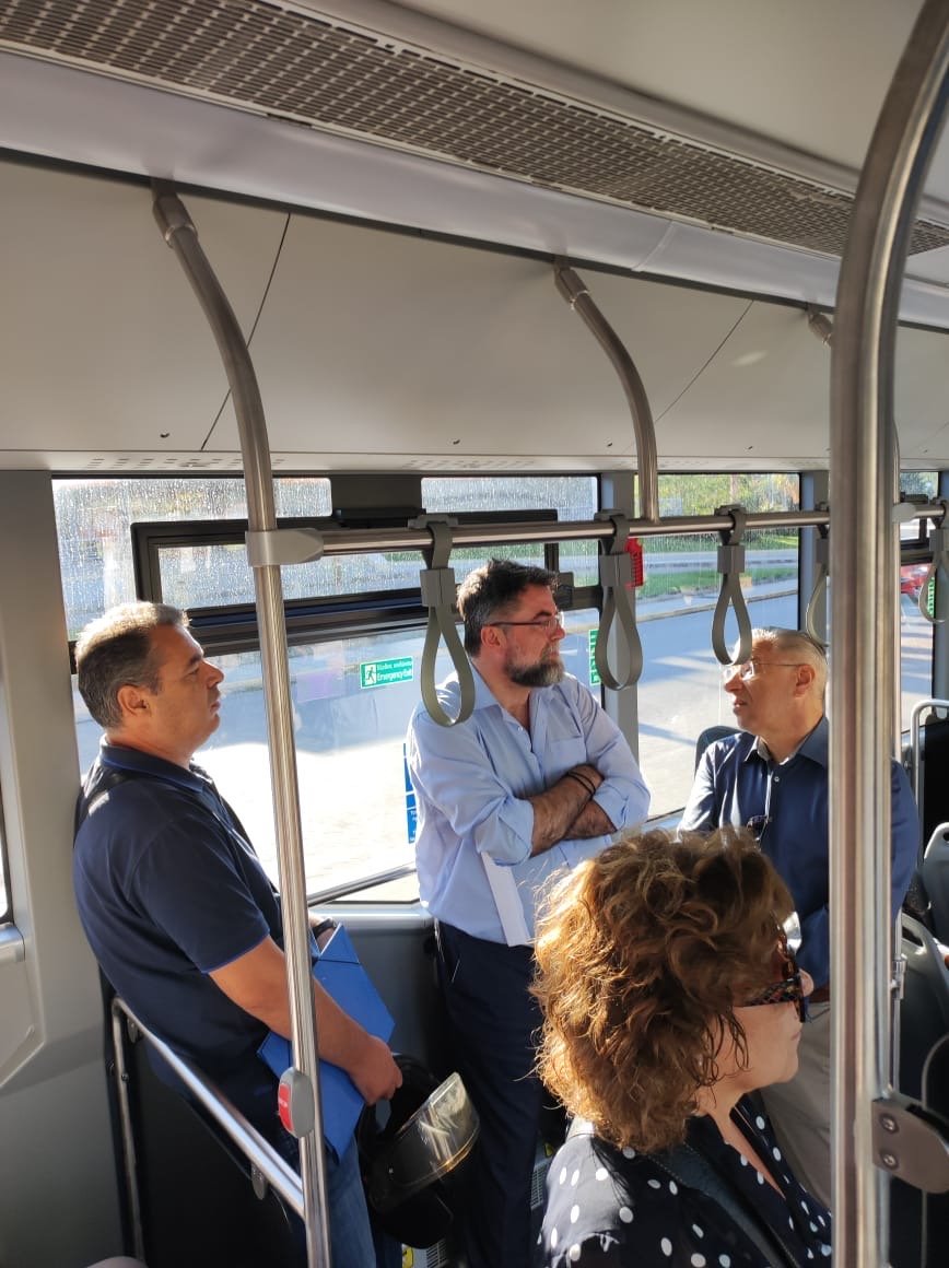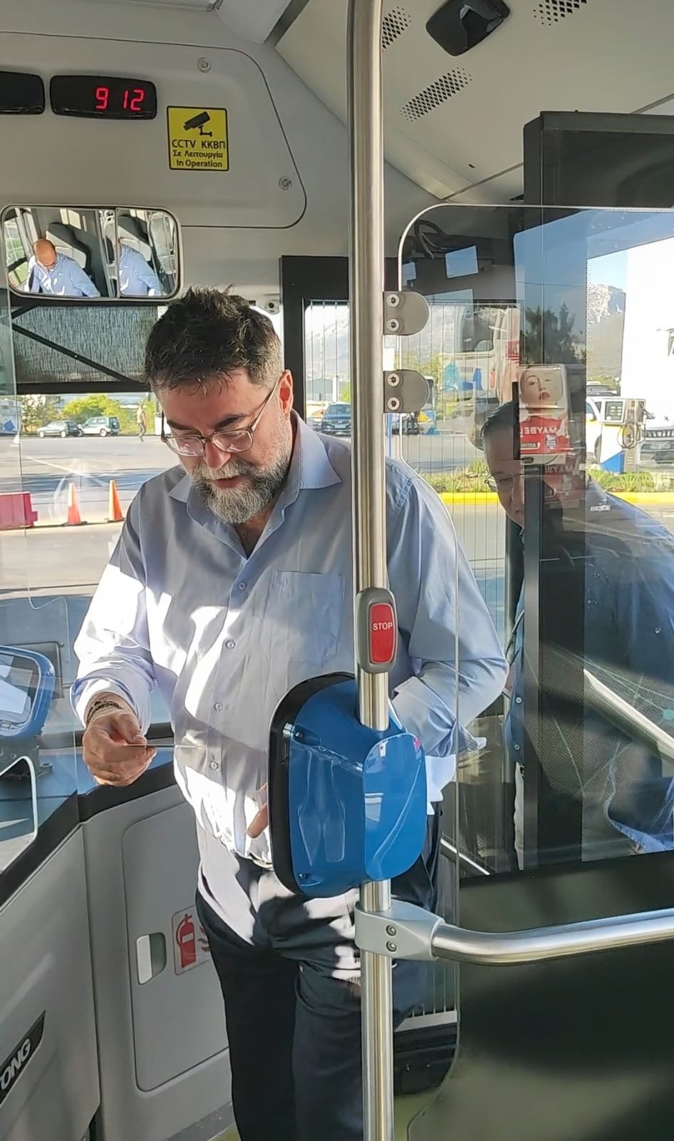 Στη συνέχεια, συνοδευόμενος από τον διευθύνοντα σύμβουλο της ΟΣΥ, Στέφανο Αγιάσογλου και το επιτελείο του, επιβιβάστηκε στο λεωφορείο της γραμμής Α5 από Ανθούσα προς Αγία Παρασκευή και προς Ακαδημία, ώστε να αποκτήσει άμεση εικόνα για τον τρόπο εφαρμογής των πιλοτικών δρομολογίων της εισόδου των επιβατών από την «μπροστινή πόρτα» για την αντιμετώπιση της εισιτηριοδιαφυγής.