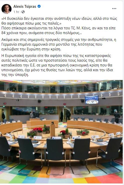 Ο πρόεδρος του ΣΥΡΙΖΑ χρησιμοποιώντας μάλιστα μία ατάκα του Τζ.Μ. Κέινς, εξέφρασε την δυσαρέσκειά του με τον τρόπο που η Γερμανία αντιμετωπίζει την κρίση στην Ευρώπη, από την πανδημία του κορωνοϊού. Η Γερμανία αντιτίθεται στην ιδέα του ομολόγου-corona, κάτι που έχει προκαλέσει αντιδράσεις στις 9 χώρες που επιμένουν για την έκδοση των ομολόγων.