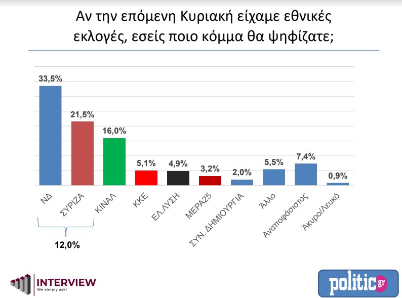 Στις 12 μονάδες διαμορφώνεται η διαφορά ΝΔ-ΣΥΡΙΖΑ σύμφωνα με τα αποτελέσματα της έρευνας. Στο ερώτημα «αν την επόμενη Κυριακή είχαμε εκλογές, ποιο κόμμα θα ψηφίζατε;» η ΝΔ σημειώνει μία μικρή άνοδο στο 33,5% από 33%, ενώ ο ΣΥΡΙΖΑ πέφτει από το 21,8% στο 21,5%. Το ΚΙΝΑΛ φτάνει το 16% (από 14,6%), ενώ το ΚΚΕ βρίσκεται στο 5,1%. Η Ελληνική Λύση στο 4,9% και το ΜέΡα 25 στο 3.2%. Το ποσοστό των αναποφάσιστων είναι στο 7.4%.