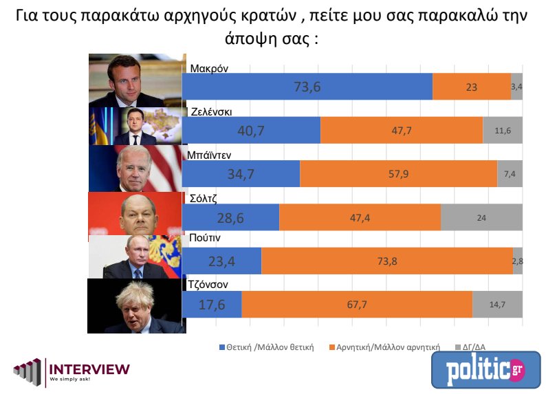 Για το πως κρίνουν οι Έλληνες τους αρχηγούς των κρατών που άμεσα ή έμμεσα εμπλέκονται στις εξελίξεις, ο Γάλλος πρόεδρος Εμανουέλ Μακρόν είναι αυτός που απολαμβάνει την υψηλότερη δημοφιλία (73,6%)