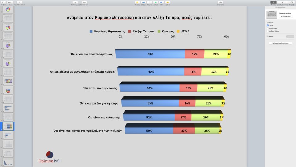 6. Ο Κυριάκος Μητσοτάκης φαίνεται πολύ ισχυρός τόσο στη δημοφιλία όσο και στην αποδοχή ως πρωθυπουργός, σε όλα τα ποιοτικά χαρακτηριστικά σε σχέση με τον Αλέξη Τσίπρα αλλά και την καταλληλότητα για πρωθυπουργός.