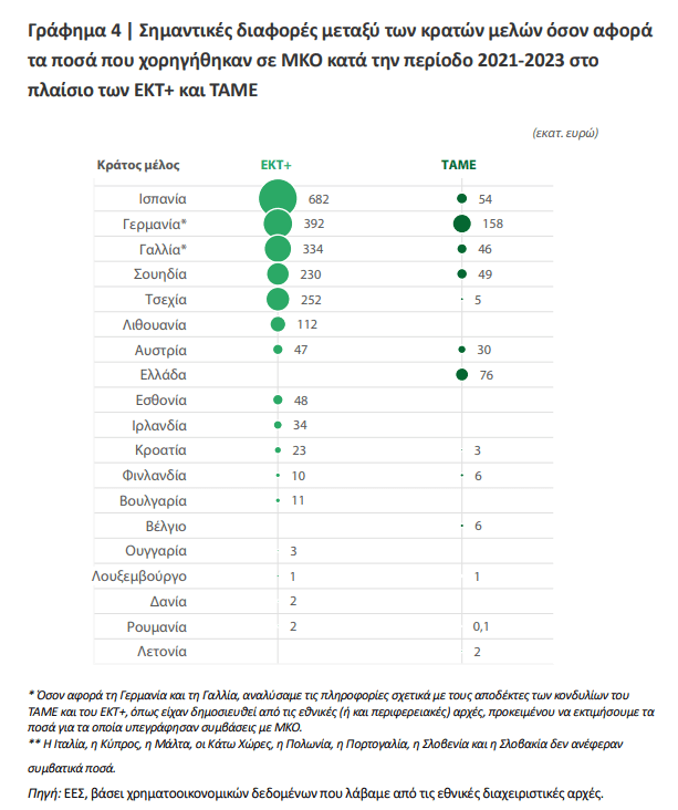 Μόνο την περίοδο 2021-2023 διατέθηκαν σε ΜΚΟ 7,4 δισ. ευρώ, στο πλαίσιο των βασικών εσωτερικών πολιτικών της ΕΕ. Τέτοιες είναι οι πολιτικές στους τομείς της συνοχής, της έρευνας, της μετανάστευσης και του περιβάλλοντος. Από το ποσό αυτό, 4,8 δισ. ευρώ χορηγήθηκαν από την Επιτροπή και 2,6 δισ. ευρώ από τα κράτη-μέλη.