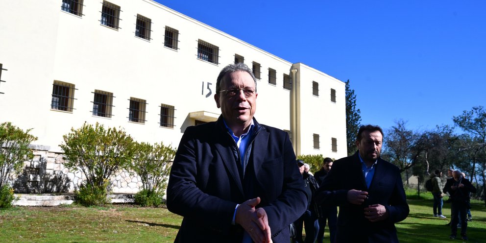 Ο Σωκράτης Φάμελλος ενημερώθηκε για την ιστορία του κτιρίου από τον διοικητή του στρατοπέδου, υποστράτηγο Θεόδωρο Ζήκο και από την ιστορικό, πανεπιστημιακό και μέλος του ΔΣ του Ινστιτούτου Νίκου Πουλαντζάς Βασιλική Λάζου.