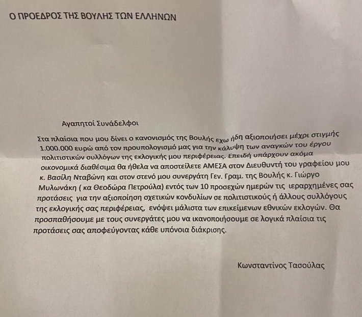 «Στα πλαίσια που μου δίνει ο Κανονισμός της Βουλής, έχω ήδη αξιοποιήσει μέχρι στιγμής ένα εκατομμύριο ευρώ από τον προϋπολογισμό μας για την κάλυψη των αναγκών του έργου πολιτιστικών συλλόγων της εκλογικής μου περιφέρειας», αναφέρει η επιστολή και επισημαίνει: «Επειδή υπάρχουν ακόμα οικονομικά διαθέσιμα, θα ήθελα να αποστείλετε ΑΜΕΣΑ στον διευθυντή του γραφείου μου κ. Βασίλη Νταβώνη και στον στενό μου συνεργάτη γενικό γραμματέα της Βουλής κ. Γιώργο Μυλωνάκη (κυρία Θεοδώρα Πετρούλα) εντός των 10 προσεχών ημερών τις ιεραρχημένες σας προτάσεις για την αξιοποίηση σχετικών κονδυλίων σε πολιτιστικούς ή άλλους συλλόγους της εκλογικής σας περιφέρειας, ενόψει μάλιστα των επικείμενων εθνικών εκλογών. Θα προσπαθήσουμε με τους συνεργάτες μου να ικανοποιήσουμε σε λογικά πλαίσια τις προτάσεις σας αποφεύγοντας κάθε υπόνοια διάκρισης».