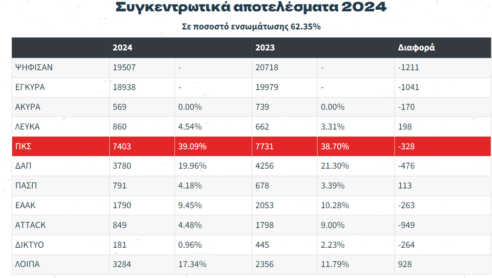 Με βάση τα μέχρι στιγμής αποτελέσματα, δεύτερη δύναμη αναδεικνύεται η ΠΚΣ με ποσοστό γύρω στο 20%, ενώ μάχη για την τρίτη θέση δίνουν ΠΑΣΠ και ΕΑΑΚ με ποσοστό της τάξης του 5%.