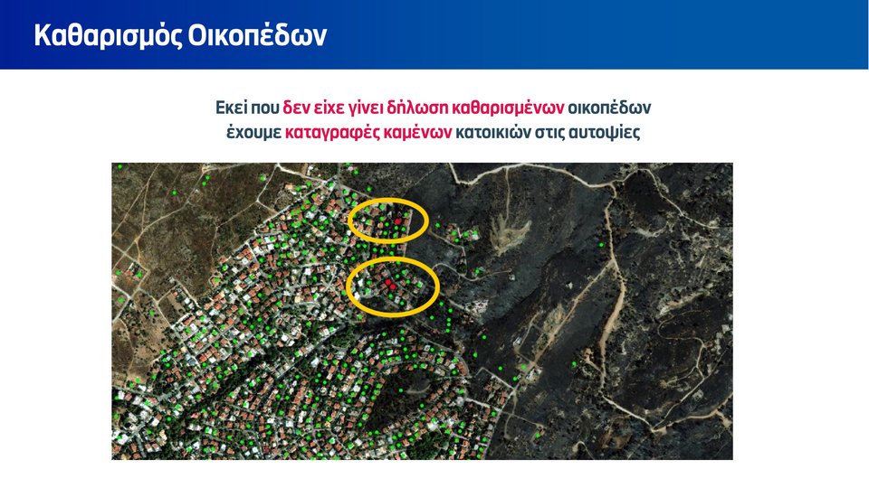 Μεταξύ άλλων, στην παρουσίαση του υπ. Ψηφιακής Διακυβέρνησης στη σύσκεψη έγιναν γνωστά τα συμπεράσματα από τις δηλώσεις καθαρισμού των οικοπέδων. Στη σχετική έκθεση αναφέρεται χαρακτηριστικά: «Εκεί όπου είχαμε δηλώσεις καθαρισμένων οικοπέδων, σε πολλές περιπτώσεις η φωτιά σταμάτησε στα όρια των οικοπέδων, ενώ προχώρησε εκεί όπου δεν είχαμε δηλώσεις καθαρισμένων».