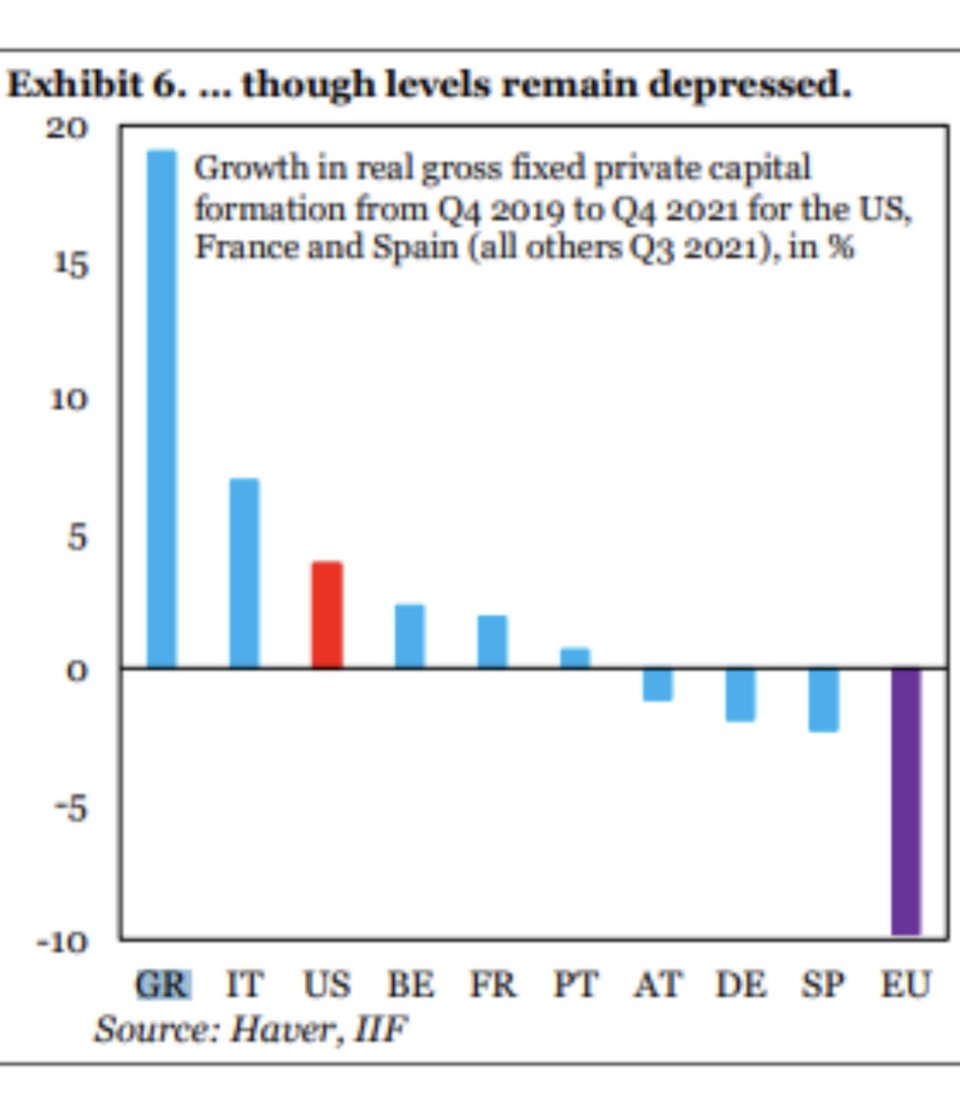 «Πρωταθλήτρια των επενδύσεων στην περίοδο από το 4ο τρίμηνο του 2019 έως το 4ο τρίμηνο του 2021, αναδεικνύεται η Ελλάδα, σύμφωνα με ανάλυση του Διεθνούς Χρηματοπιστωτικού Ινστιτούτου (Institute of International Finance, IIF). Τη συγκεκριμένη περίοδο ο ρυθμός πραγματικής αύξησης των επενδύσεων (ακαθάριστου σχηματισμού παγίου κεφαλαίου) προσεγγίζει το 20% στην Ελλάδα, επίδοση που καθιστά τη χώρα μας παγκόσμια πρωταθλήτρια των επενδύσεων και μάλιστα με μεγάλη διαφορά από την δεύτερη χώρα, ενώ μάλιστα στην ευρωζώνη σημειώνεται πτώση της τάξης του 10%.