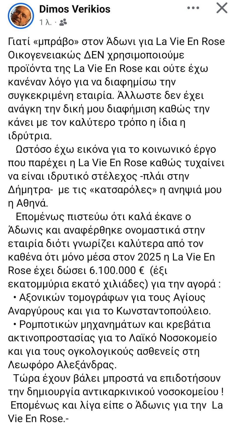 «Μπράβο» στον υπουργό Υγείας για τη διαφήμιση της γνωστής εταιρείας καλλυντικών είπε και ο δημοσιογράφος Δήμος Βερύκιος, σε ανάρτησή του:
