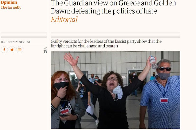 Στην καταδίκη της Χρυσής Αυγής, που «δείχνει ότι η ακροδεξιά» όπως κι η «πολιτική του μίσους μπορούν να νικηθούν», αναφέρεται ο Guardian.