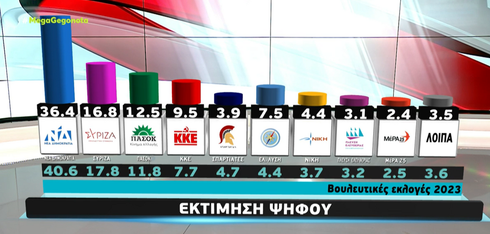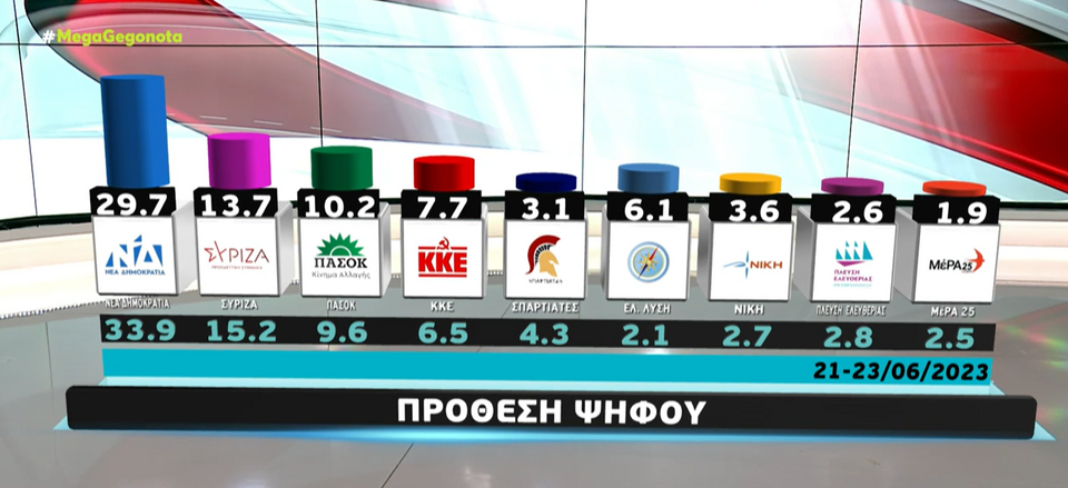 Στη δημοσκόπηση της Metron Analysis, για το Mega, η διαφορά ΝΔ-ΣΥΡΙΖΑ είναι στις 16 μονάδες στην πρόθεση ψήφου (29,7% έναντι 13,7%) και εκτινάσσεται στο 19,6% στην εκτίμηση ψήφου (ΝΔ 36,4%, ο ΣΥΡΙΖΑ 16,8%).