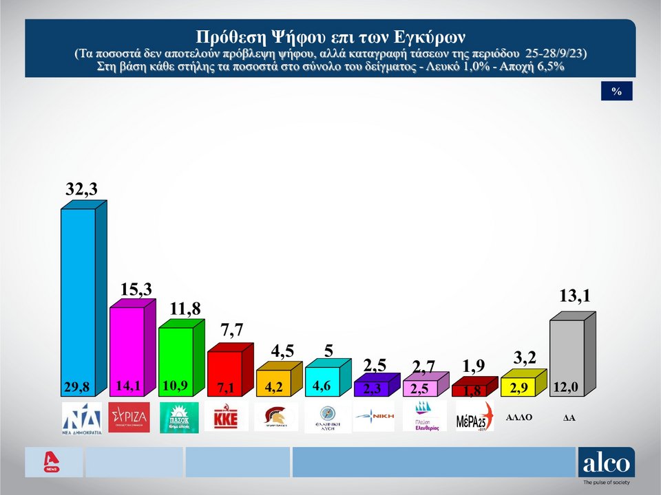 Δημοσκόπηση Alco: Στο 32,3% η ΝΔ, 15,3% ο ΣΥΡΙΖΑ -Χειρότερη η εικόνα μετά τον Κασσελάκη, λέει το 40%