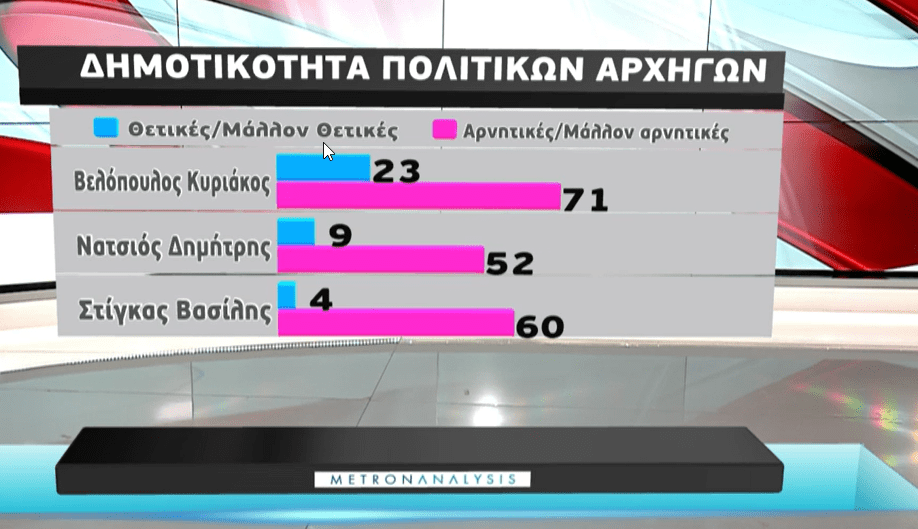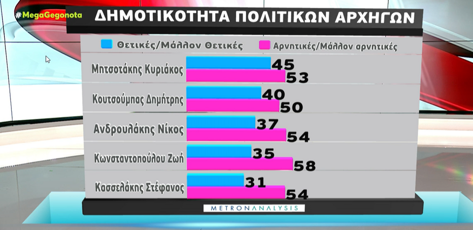 Σε ότι αφορά στη δημοφιλία των πολιτικών αρχηγών ο Κυριάκος Μητσοτάκης, μετά από 4 χρόνια στην πρωθυπουργία, είναι πρώτος με 45% θετικές γνώμες, έναντι 53% αρνητικών, και ο κ. Κασσελάκης μόλις πέμπτος με 54% αρνητικές-31% θετικές ψήφους πίσω από Κουτσούμπα, Ανδρουλάκη και Ζωή Κωνσταντοπούλου.
