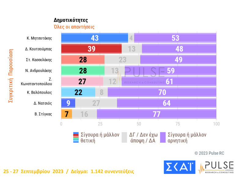 Ο Κυριάκος Μητσοτάκης παραμένει στην πρώτη θέση στη δημοφιλία των πολιτικών αρχηγών, ακολουθεί ο Δημήτρης Κουτσούμπας, ενώ ο Στέφανος Κασσελάκης είναι τρίτος με 28% θετικές γνώμες και 49% αρνητικές. Τέταρτος είναι ο Νίκος Ανδρουλάκης με 28% θετικές γνώμες και 59% αρνητικές.