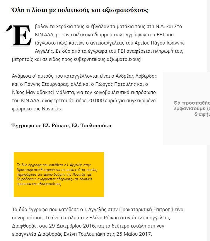 Δύο τουλάχιστον χρόνια πριν ήταν γνωστά σε όλους - και στον ΣΥΡΙΖΑ και στην Ελένη Τουλουπάκη - οι καταθέσεις «κουκουλοφόρων» μαρτύρων, στο έγγραφο του FBI, σχετικά με τη Novartis.