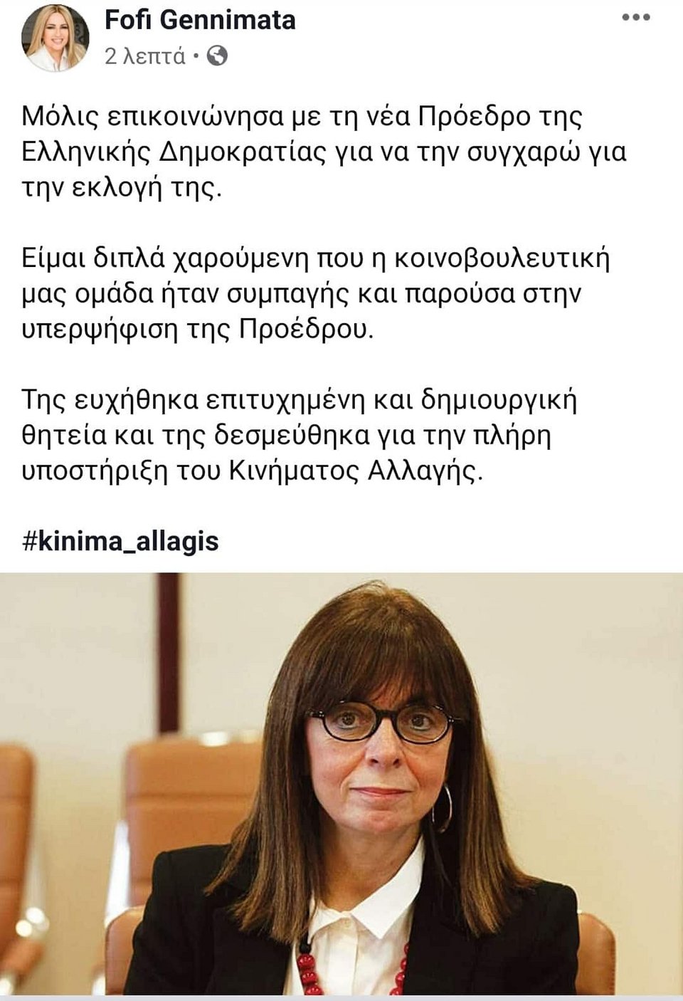 Η πρόεδρος του Κινήματος Αλλαγής, Φώφη Γεννηματά επικοινώνησε με τη νέα Πρόεδρο της Ελληνικής Δημοκρατίας, Αικατερίνη Σακελλαροπούλου για να την συγχαρεί για την εκλογή της.