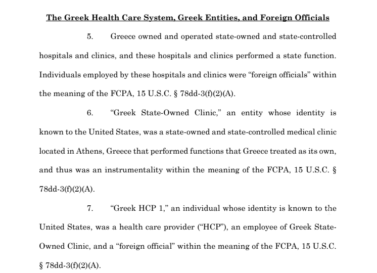 Επίσης στο σημείο 7 της ίδιας σελίδας αναφέρεται σε «Ελληνα Πάροχο Υγείας» (HCP) κάνοντας λόγο για άτομο - η ταυτότητα του οποίου είναι γνωστή στις ΗΠΑ - και ο οποίος ήταν Πάροχος Υγείας, (Health Care Provider-HCP), υπάλληλος σε ελληνική δημόσια κλινική και «ξένος αξιωματούχος» με την έννοια που προσδίδει στον όρο η Επιτροπή Κεφαλαιαγοράς των ΗΠΑ.